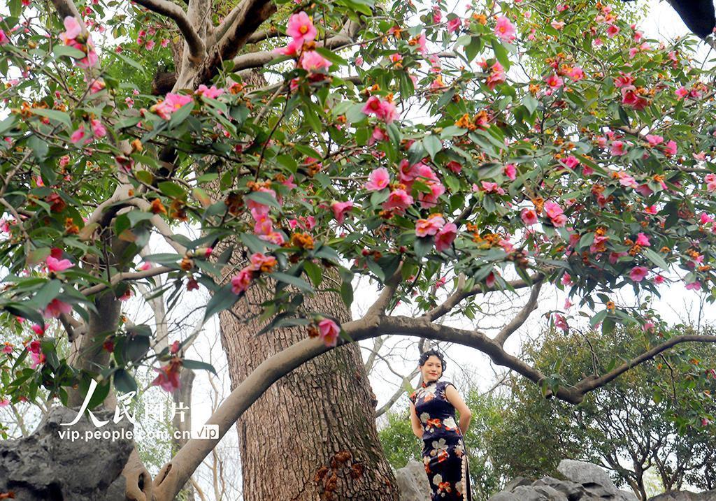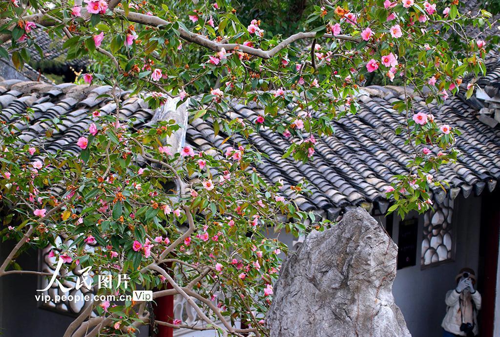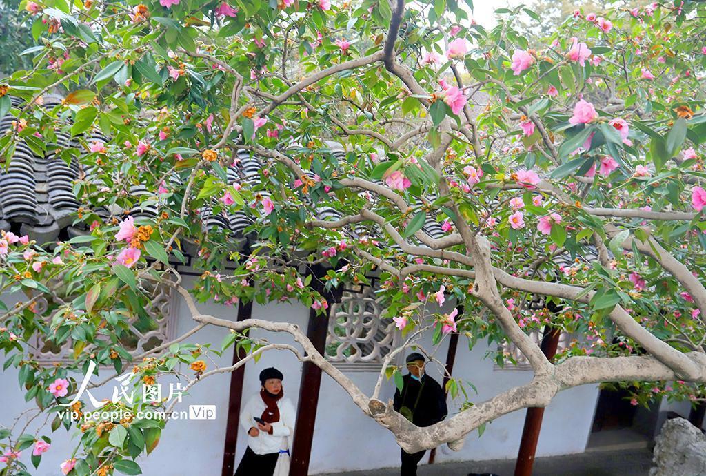 2025年2月21日,在苏州古典园林沧浪亭内,一株拥有百余年悠久历史的山茶花傲然绽放,花朵绚烂多彩,美不胜收,宛如一幅精美的画卷,吸引了络绎不绝的游客驻足观赏,纷纷举起相机记录下这难得的美景。王建康摄(人民图片网)